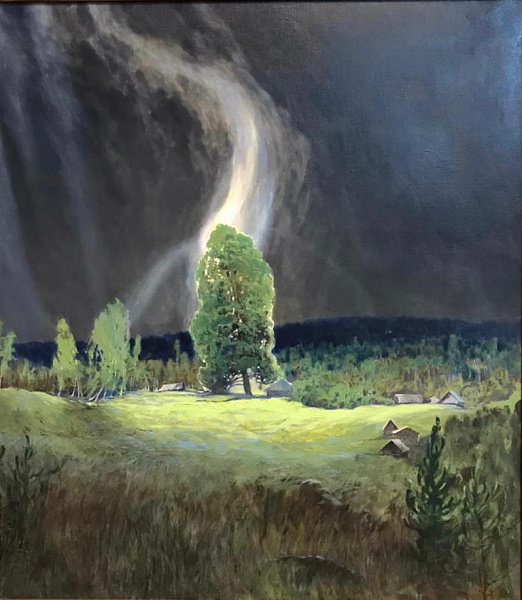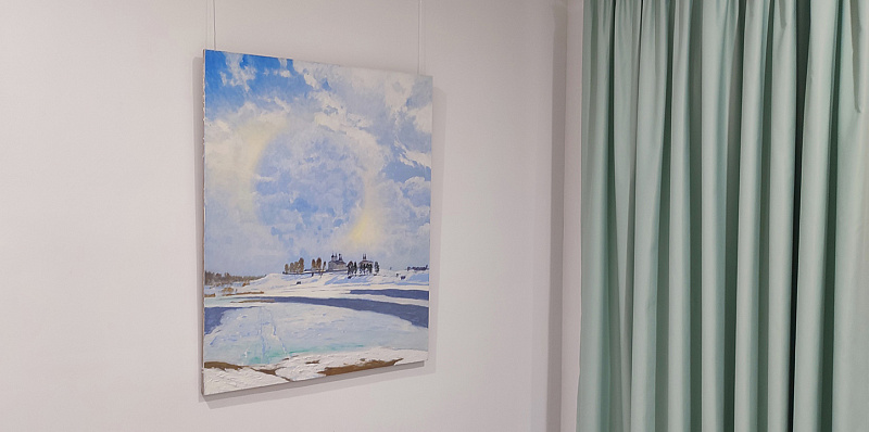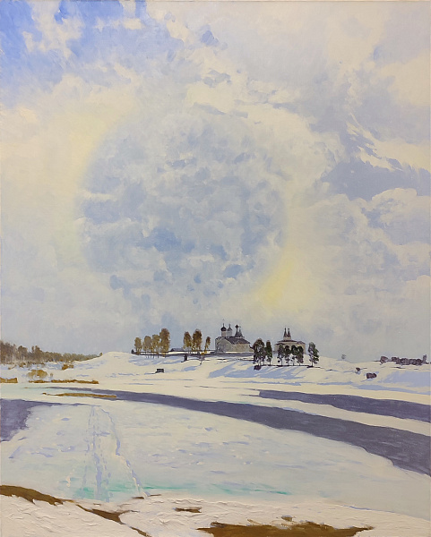 Живопись Александра Афонина, сюжеты которые он выбирает для своих картин это сплав той самой пейзажности и светолития, свечения, «умозрения в красках». В широкий равнинный пейзаж, пересечённый невысокими холмами, художник вписывает русские церкви, как завершающий штрих, как необходимый акцент среди стелющихся волнистых линий. На выставке в РАМС мы показали картины Александра Афонина «Ферапонтово. Лед и пламень», «Зимняя радуга. Ферапонтово», «Радуйся, Благодатная, Купино Неопалимая»