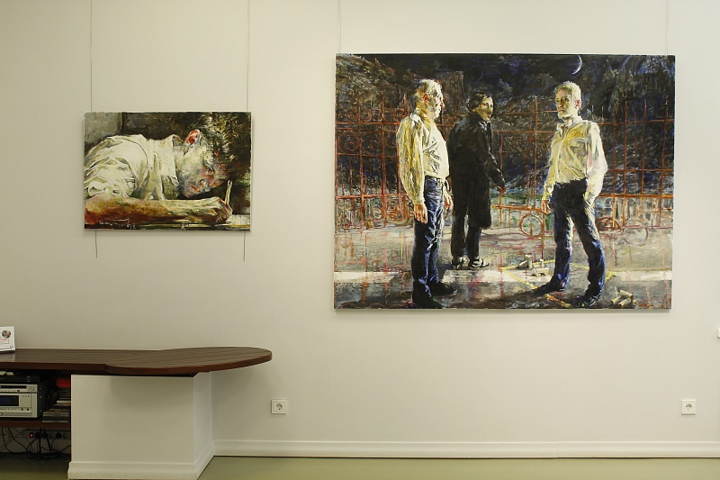 Одна из ключевых картин экспозиции - «Городки» - реплика написанной Базилевым в 1983 году «Однажды на дороге». То полотно, икона творческой группы «Шесть», было создано по мотивам крымских путешествий и писалось со слайдов, сделанных во время поездки. Группа стильно одетых молодых людей кажется подозрительно современной. Камера застала их врасплох где-то на южном берегу Крыма. Между друзьями разыгрывается активный диалог. Но отличительная особенность гиперреализма - подчеркнутая нейтральность, поэтому сцену можно воспринимать и как дружескую беседу, и как напряжённый момент спора, и как начало конфликта.