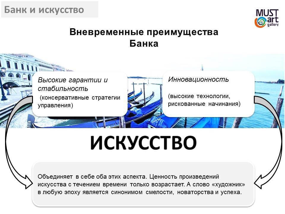 Сложившаяся ситуация на российском арт - рынке и уже существующие способы взаимодействия банков с искусством предполагают новые формы сотрудничества: галерея современного искусства начинает выступать не только в традиционной роли эксперта в области арт-рынка, но и в качестве стратегического пиар партнера. Подобное взаимодействие позволяет структурировать долгосрочную пиар кампанию, направленную как непосредственно на клиентов, так и на более широкую аудиторию городов присутствия банка. Многоступенчатая PR - концепция позволяет найти комплиментарный подход к каждой из целевых групп, сохраняя целостность долгосрочной имиджевой стратегии в целом комплексе мероприятий : от демонстрации в самом широком диапазоне СМИ высокого уровня социальной ответственности банка и поддержки им отечественной культуры в целом, до организации закрытых имиджевых мероприятий для VIP-клиентов в формате светского салона.